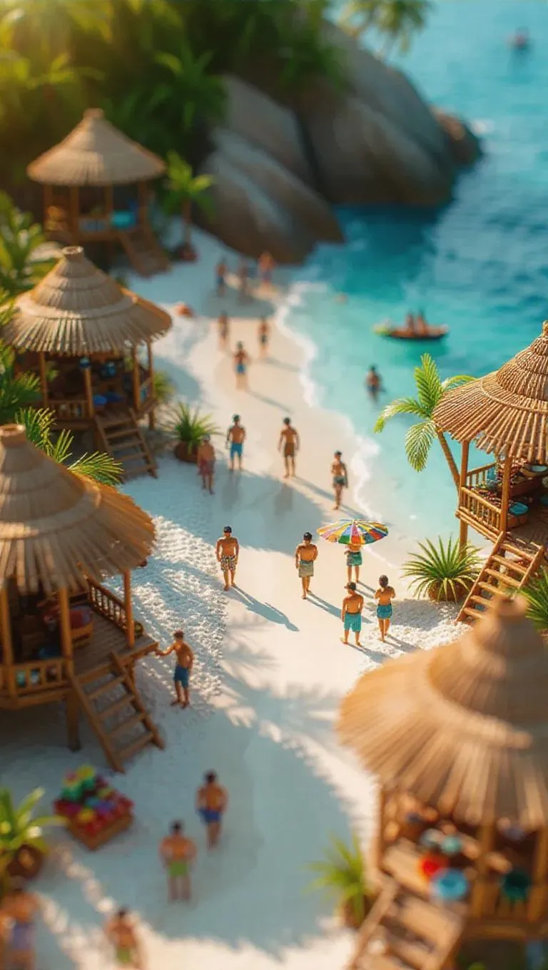A miniature island town with bamboo huts, sandy paths, and a lively market. Tiny people relaxing by the beach, some snorkeling, others selling handmade crafts. Bright, tropical sunlight casts a vibrant glow, enhancing the festive and relaxed vibe.