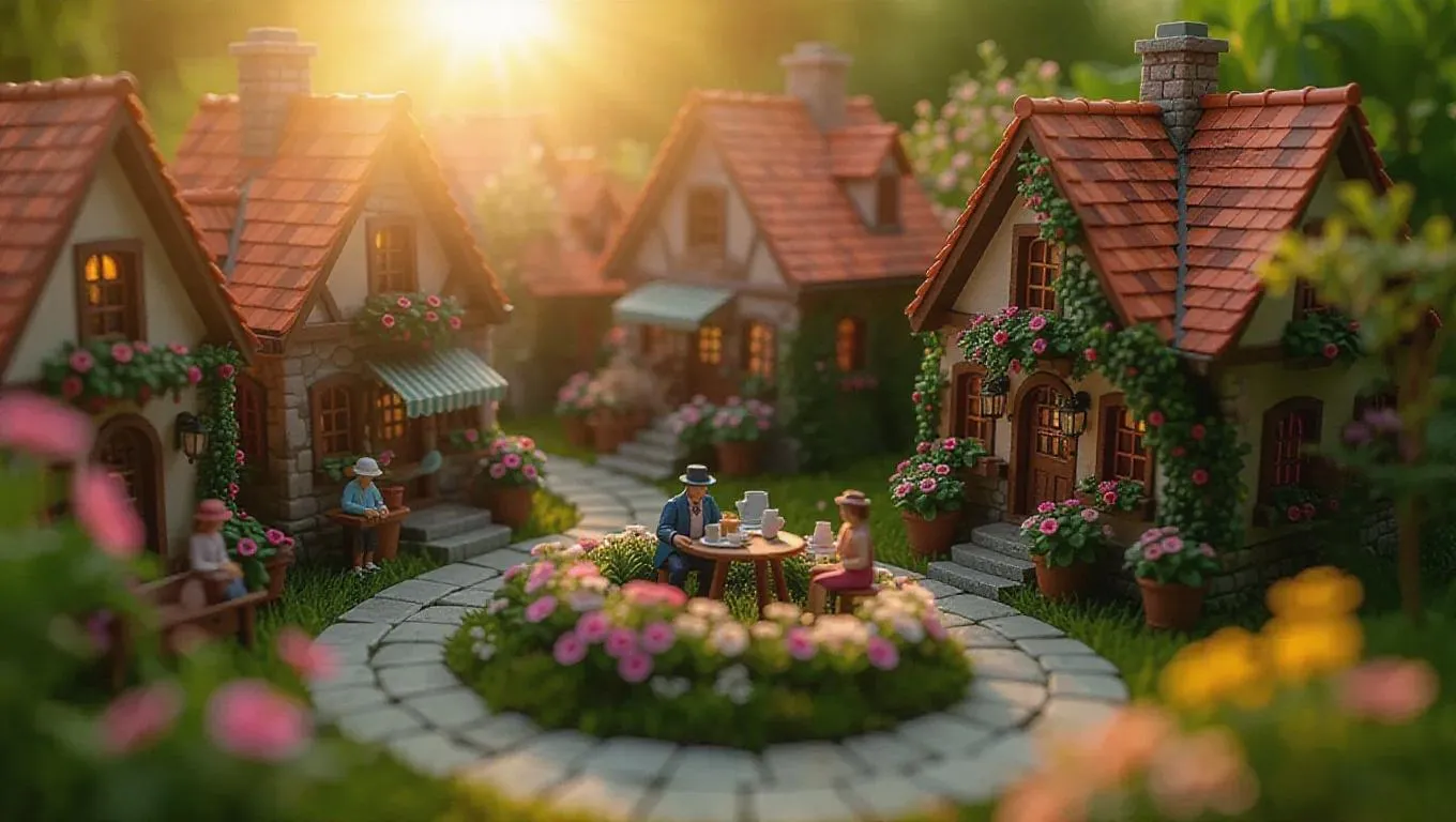 A miniature garden town with flower-adorned houses, stone paths, and a blooming square. Tiny people gardening, some painting, others enjoying tea. Soft, fragrant sunlight casts a gentle glow, enhancing the whimsical and serene atmosphere.