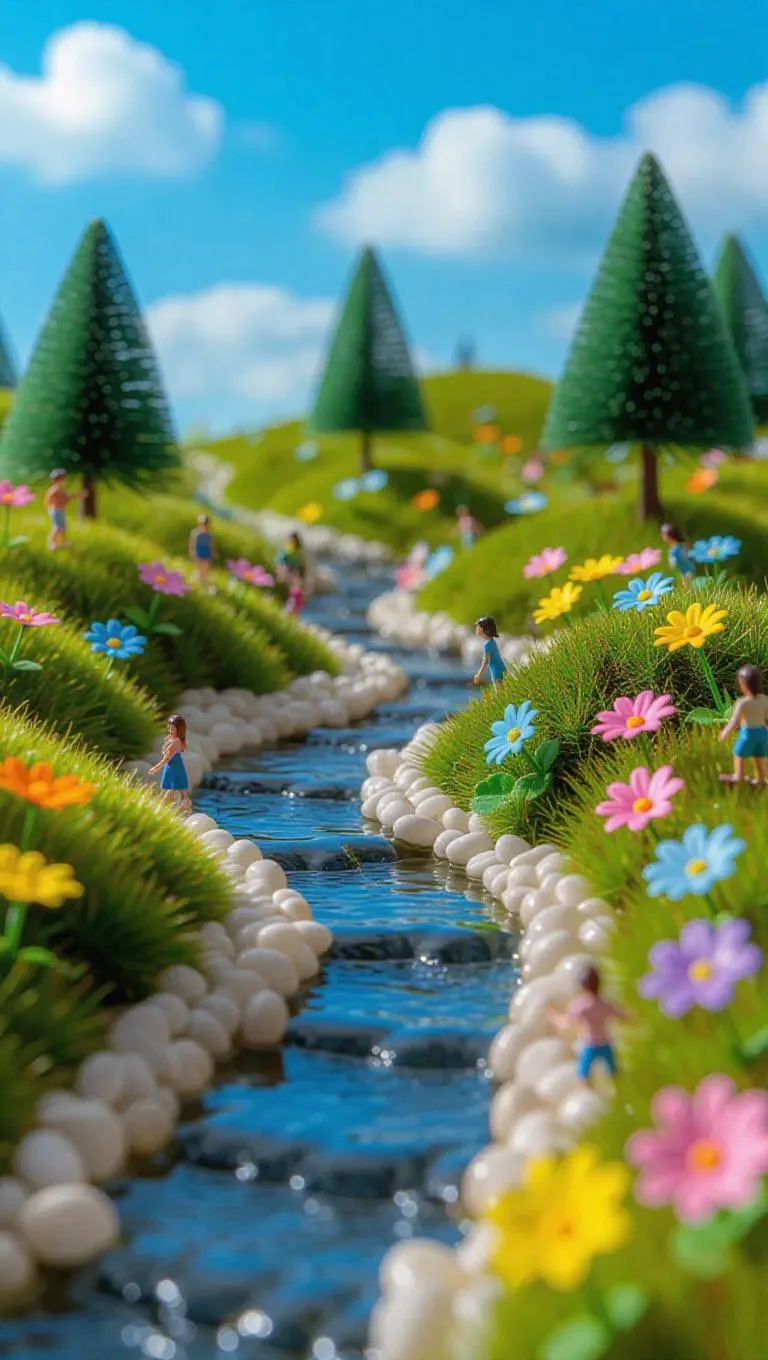A group of tiny, thumb-sized workers is diligently cleaning a rugged, mountain bike, which is the centerpiece of the image. The bike is parked on a muddy surface, possibly a trail, and has brown splatters on its frame, indicating that it has been recently washed or sprayed. The miniature workers are positioned around the bike, some lifting their tiny arms while others reach for brushes. They seem to be focused on their task, using tiny sponges and buckets to scrub and rinse the vehicle. The surrounding environment is adorned with a cloudy, stormy sky, which casts a moody, diffused light over the scene. There are a few scattered rocks and a small signpost visible in the background, but no other objects or people are present, and no text or distinctive markings are visible.