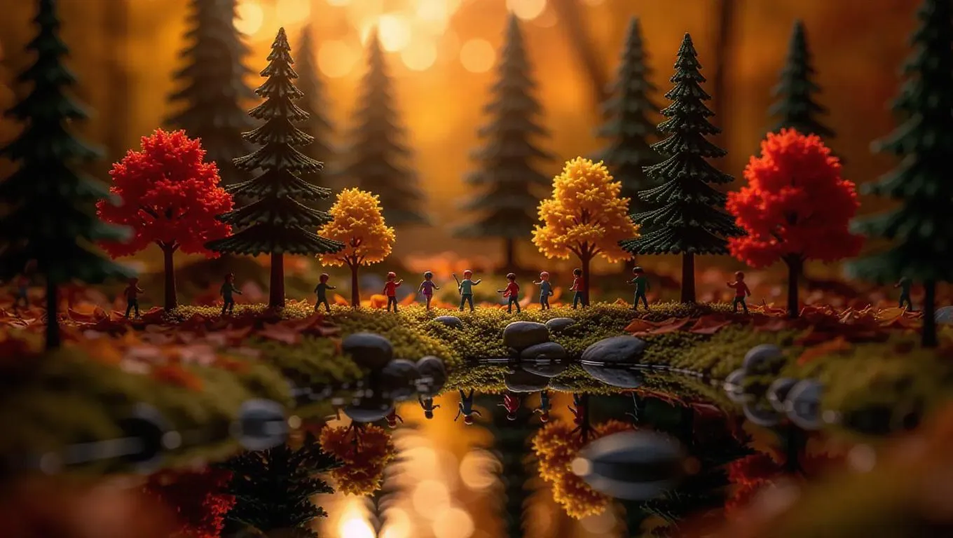 A miniature enchanted forest during autumn with tiny, colorful trees, leaf-covered ground, and a quiet pond. Tiny adventurers explore the forest, some raking leaves, others skipping rocks on the pond. Warm, cozy background with golden sunlight filtering through the foliage, creating a magical atmosphere.