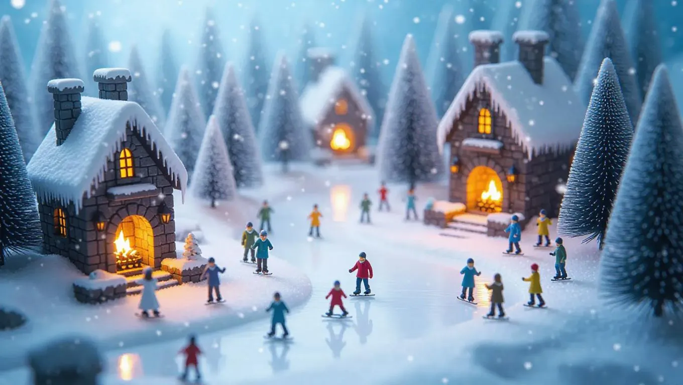 A miniature enchanted winter wonderland with tiny, snow-covered trees, ice-covered paths, and a glowing fireplace. Tiny adventurers explore the wonderland, some ice skating, others building snowmen. Crisp, clear background with soft white snowflakes falling, creating a magical atmosphere.