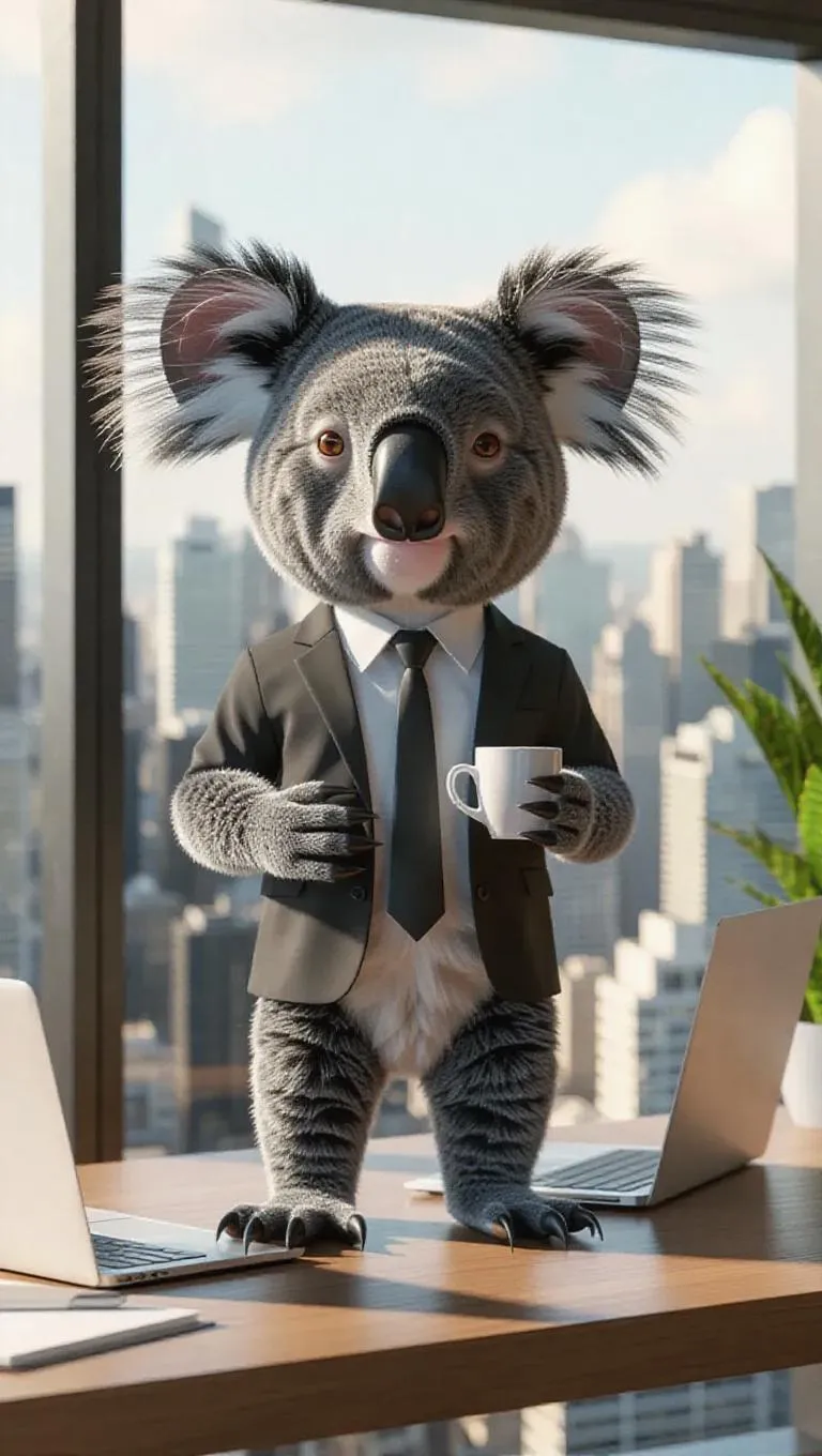 A 3D koala image wearing a business suit and tie, standing upright on two legs like a human, holding a laptop and a coffee cup, surrounded by a modern office desk and a cityscape view through the window, exuding a professional and focused atmosphere.