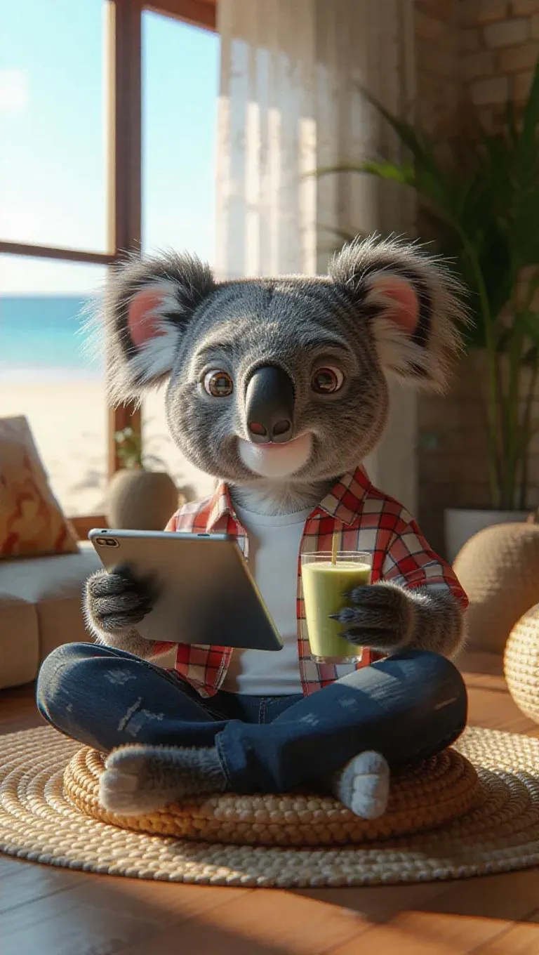 A 3D koala image wearing a casual shirt and jeans, sitting cross-legged on a floor cushion, holding a tablet and a smoothie, surrounded by a cozy living room and a beach view through the window, exuding a relaxed and cheerful atmosphere.