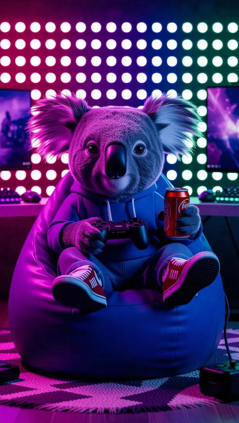 A 3D koala image wearing a casual hoodie and sneakers, lounging on a beanbag chair, holding a video game controller and a soda can, surrounded by a gaming setup and a colorful LED backdrop, exuding a playful and immersive atmosphere.