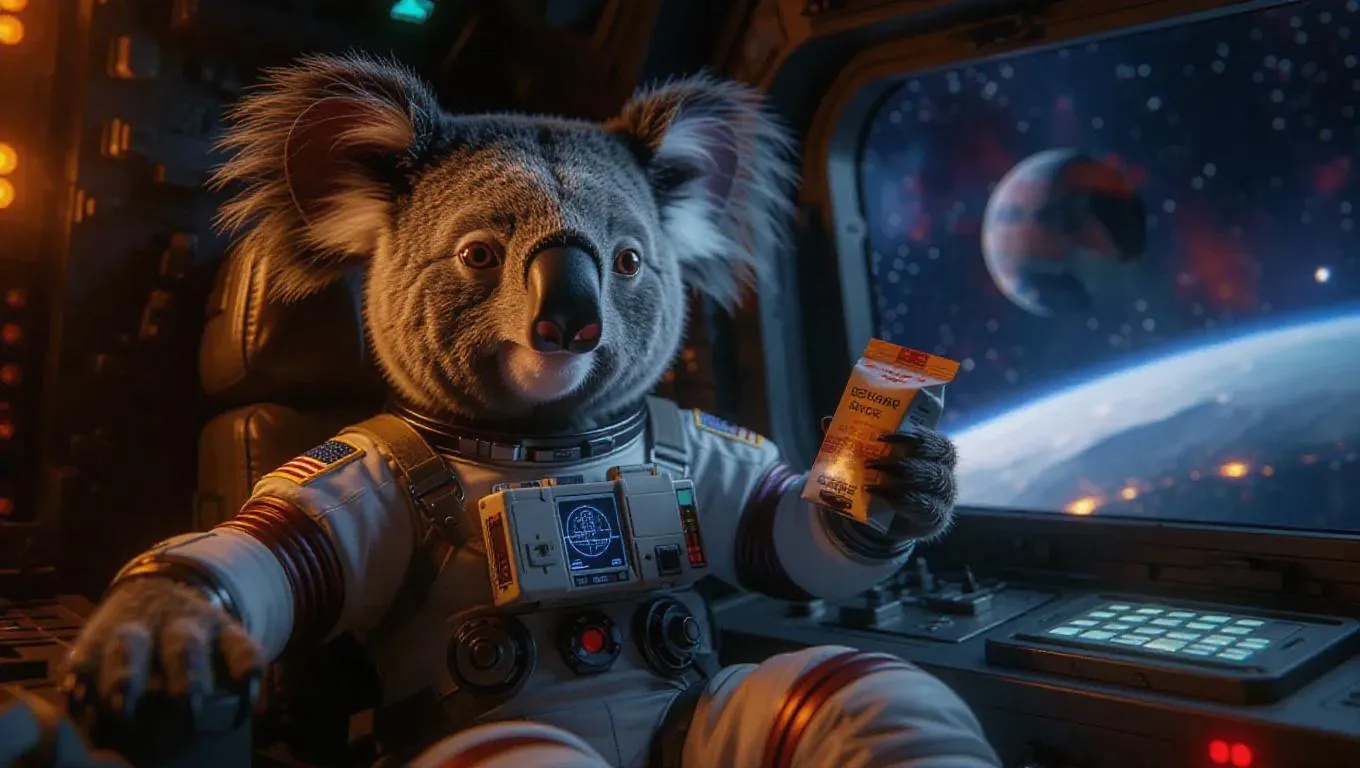 A 3D koala image wearing a space suit, floating in a spaceship, holding a control panel and a snack pack, surrounded by stars and a planet view through the window, exuding an imaginative and mysterious atmosphere.