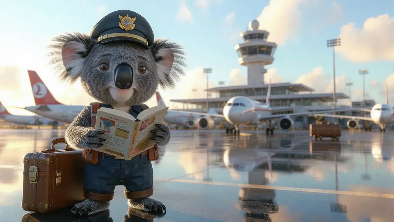 A 3D koala image wearing a pilot’s uniform and cap, standing in an airport, holding a flight manual and a suitcase, surrounded by airplanes and a control tower, exuding a professional and adventurous atmosphere.