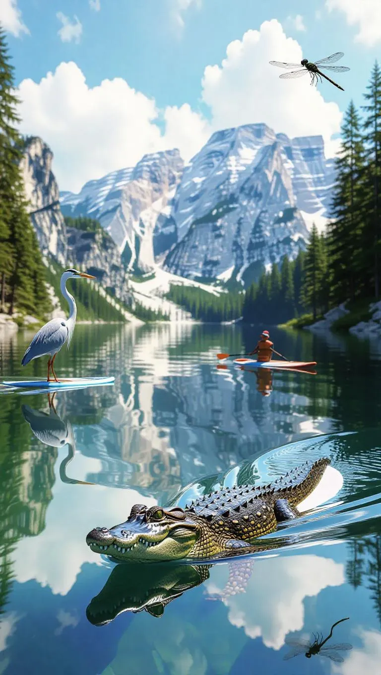 An exciting paddleboarding race on a beautiful mountain lake, where a squirrel, heron, and alligator glide along. The squirrel's speed keeps it near the front, the heron's height gives it an edge, and the alligator's strength keeps it steady. Nearby, a group of curious dragonflies zips around, adding to the view.
