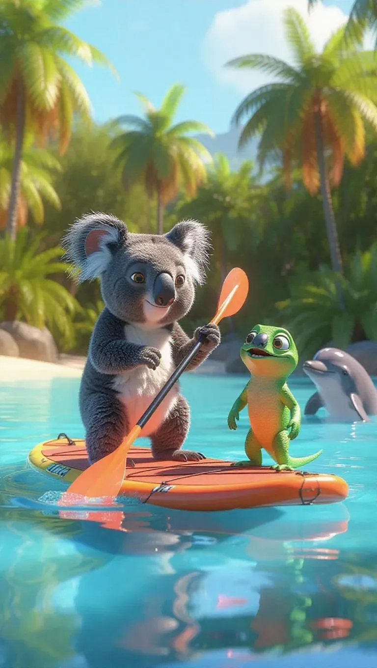 An animated paddleboarding challenge on a lush tropical lagoon featuring a koala, parrot, and gecko. The koala's calm demeanor aids its stability, the parrot's vibrant feathers help it stand out, and the gecko's quick movements keep it in contention. Nearby, a family of dolphins playfully watches the scene unfold.