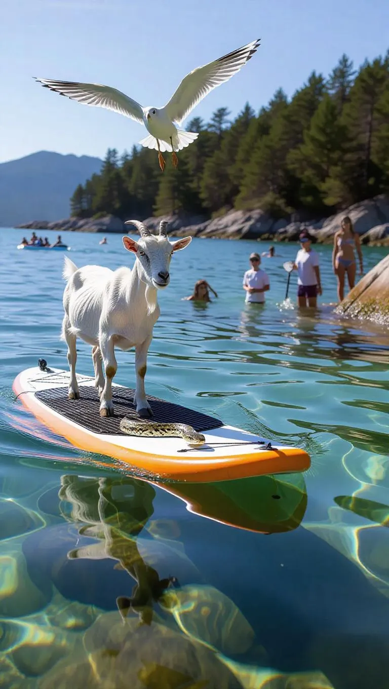 A vibrant paddleboarding spectacle during a bright afternoon in a calm bay, where a goat, gull, and snake showcase their skills. The goat's agility enables impressive balancing, the gull's keen eyesight helps it spot opportunities, and the snake’s flexibility allows for unique maneuvers. Nearby, a group of sea stars watches in wonder.