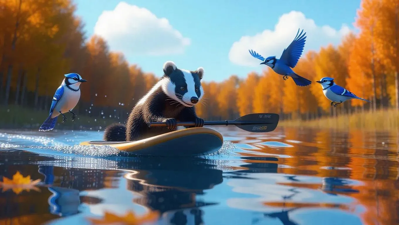 A lively paddleboarding race on a quiet lake in autumn, featuring a badger, blue jay, and newt. The badger's determination helps it maintain its speed, the blue jay's aerial skill allows for clever tactics, and the newt's steady pace contributes to the excitement. Nearby, a group of leaves drifts on the water, adding to the aesthetic.
