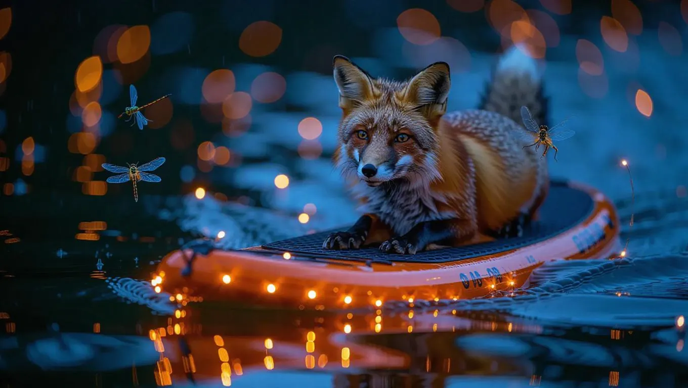 A competitive paddleboarding event on a glowing river at dusk, showcasing a fox, dragonfly, and fish. The fox’s cleverness helps it strategize, the dragonfly’s speed keeps it at the forefront, and the fish’s playful nature makes for amusing distractions. Fireflies begin to illuminate the scene as the sun sets.