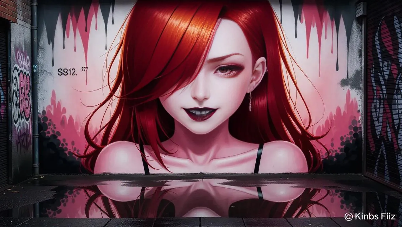 A weathered alley wall features a striking mural of a solitary anime girl with flame-red hair cascading over one eye, her pale skin contrasted by bold black lips and a subtle mole beneath half-lidded eyes. Cinematic lighting highlights her stud earrings and bare shoulders, accentuating her Glasgow smile and sharp fangs as reflective puddles below mirror her solemn expression. Soft greys and blush-pink tones blend into rain-dampened concrete, creating a dreamlike fusion of melancholy and romance through delicate linework and muted realism. The scene balances eerie elegance with nostalgic tenderness, merging urban decay with ethereal character details like chipped nail polish, smudged mascara, and wisps of hair catching unseen breezes.