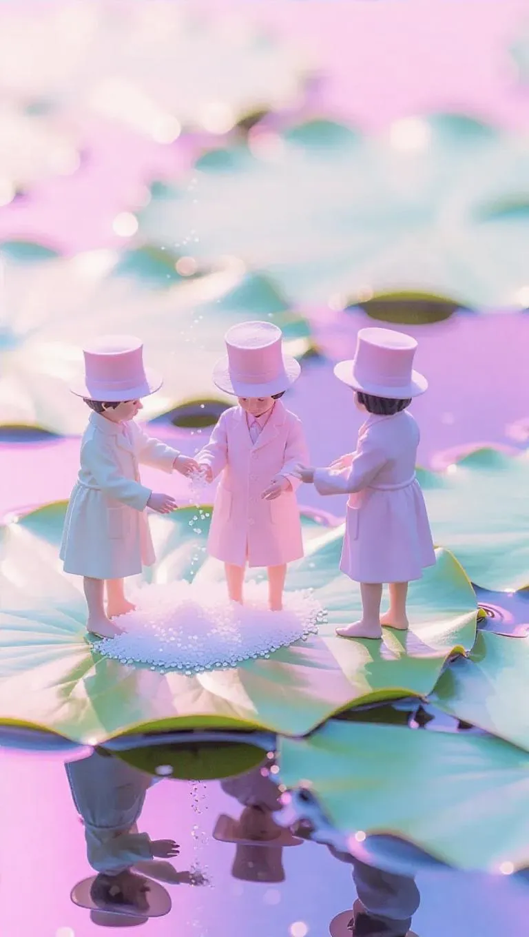 Several thumb-sized figures, wearing pastel-colored smocks and top hats, stand delicately on a glowing lily pad, gently sprinkling shimmering sand onto its surface. The intricate leaves and tranquil water create a whimsical setting, capturing a moment of magic and wonder.
