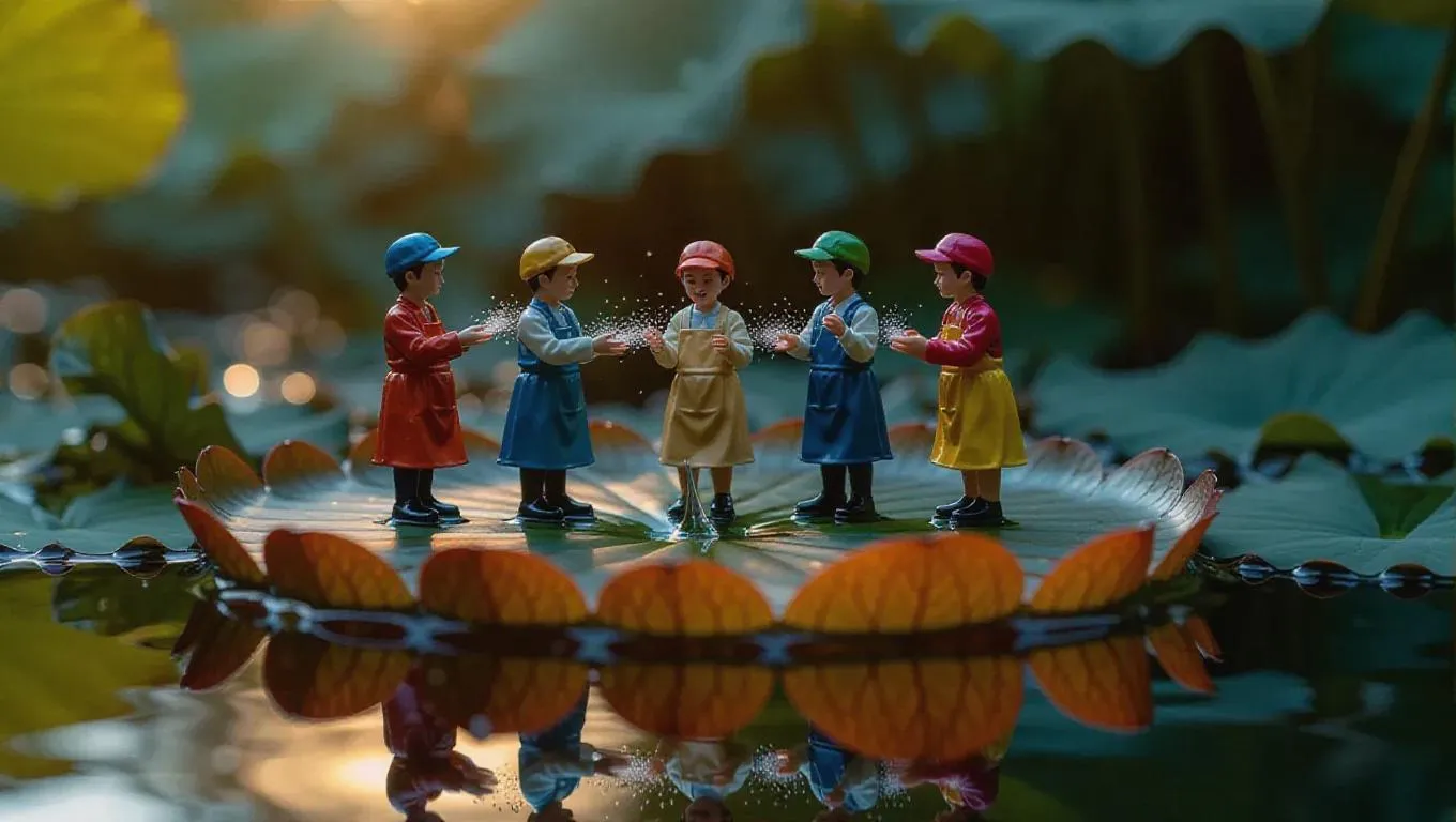 Several thumb-sized figures, wearing colorful smocks and flat caps, stand delicately on a glowing lily pad, gently sprinkling misty vapor onto its surface. The intricate leaves and clear water create a serene setting, capturing a moment of tranquility and peace.