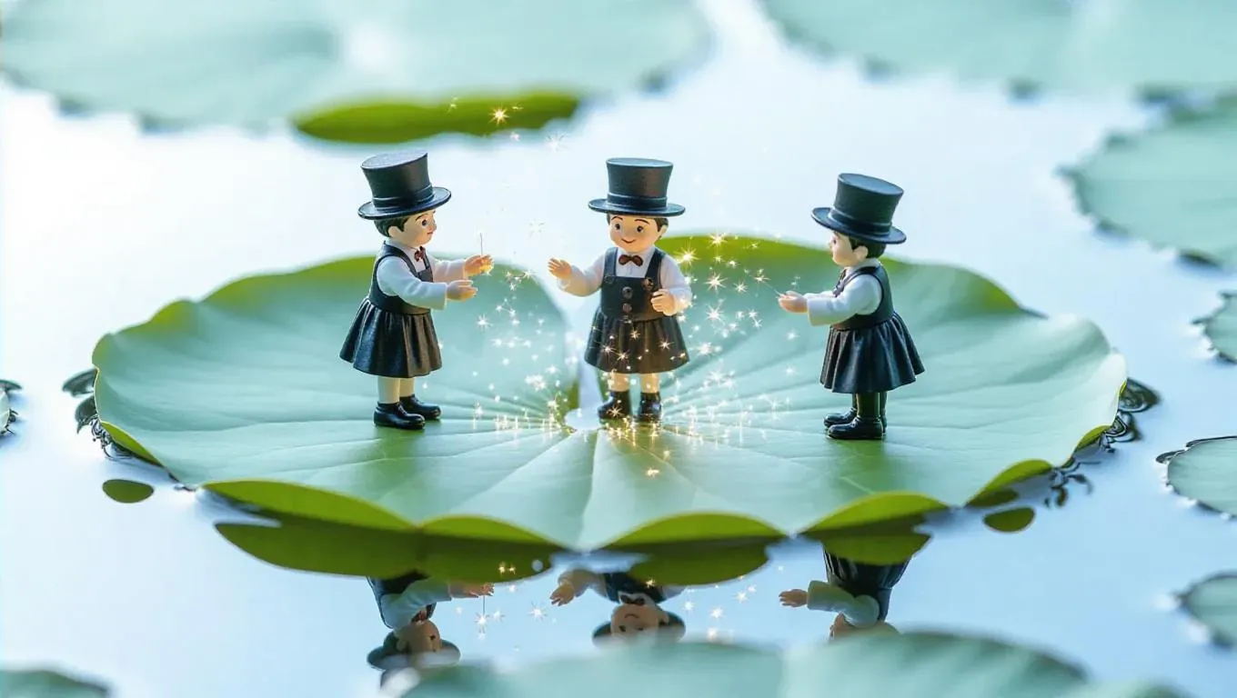 Several thumb-sized figures, wearing whimsical smocks and top hats, stand delicately on a glowing lily pad, gently sprinkling sparkling stars onto its surface. The intricate leaves and reflective water create a charming setting, capturing a moment of fascination and joy.