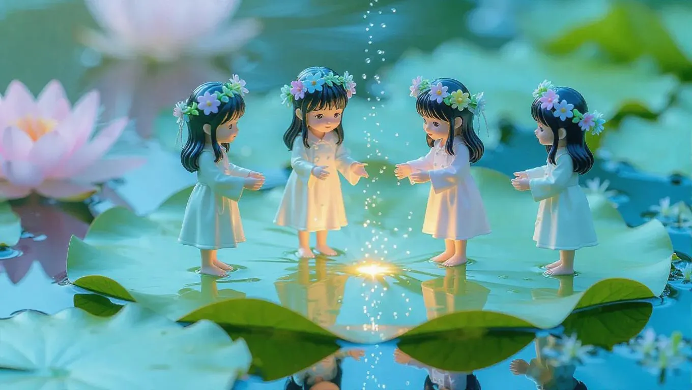 Several thumb-sized figures, wearing pastel smocks and flower crowns, stand delicately on a glowing lily pad, gently sprinkling shining dust onto its surface. The intricate leaves and serene water create a fairytale setting, capturing a moment of enchantment and bliss.