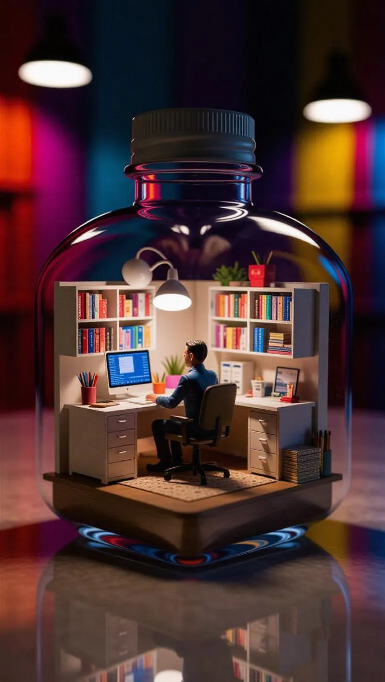 A highly detailed miniature office setup inside a transparent plastic bottle, featuring a fully furnished workspace with a modern desk, computer, chair, office supplies, and tiny bookshelves. A small human figure sits at the desk, diligently working on the computer. Soft, warm interior lighting casts a cozy glow, enhancing the inviting atmosphere. The bottle rests on a smooth, neutral-colored surface with a subtle reflection, set against a vibrant, colorful background. Rendered in a hyper-realistic 3D style with ultra-sharp details and lifelike textures.