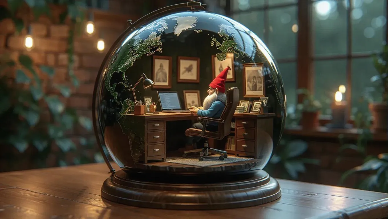 A highly detailed miniature office setup inside a transparent globe, featuring a fully furnished workspace with a chic desk, laptop, swivel chair, office supplies, and tiny picture frames. A small gnome figure sits in the chair, intently reading. Soft, soft illuminating interior lighting casts a serene glow, enhancing the calm atmosphere. The globe rests on a polished, light-colored surface with an idyllic reflection, set against an outdoor-inspired, lively background. Rendered in a hyper-realistic 3D style with ultra-sharp details and lifelike textures.