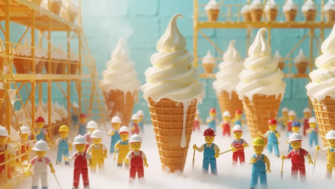 A crew of tiny laborers clad in helmets and aprons is engaged in work inside a vast ice cream cone. Some are stirring sweet blends with sizeable whisks, while others freeze treats on a small conveyor, with frosty mist rising like smoke. The entire environment echoes the hustle of an ice cream factory, complete with ladders and scaffolding.