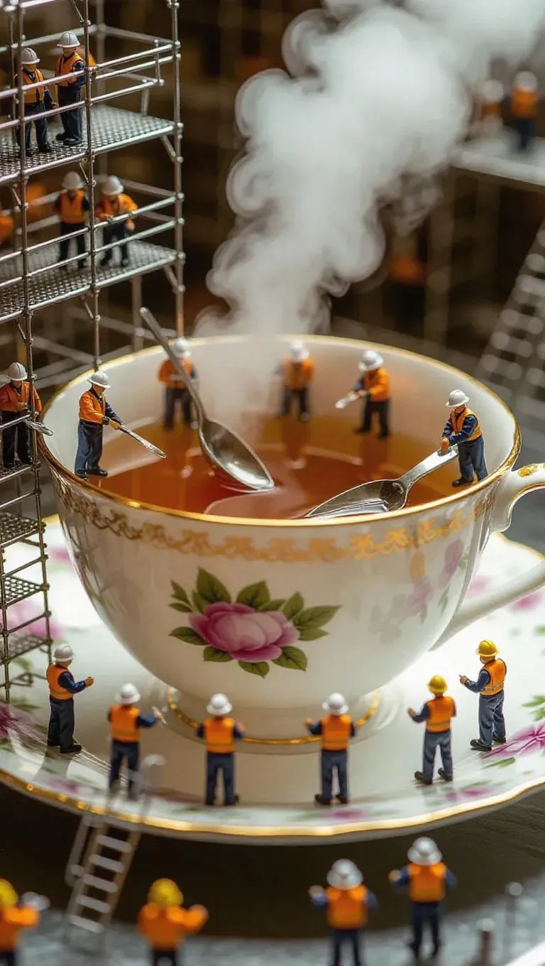 A team of thumb-sized workers in safety helmets and aprons is working inside a massive teacup. Some are stirring the tea with giant spoons, others are drying leaves on a miniature conveyor belt, while steam rises like factory smoke. The whole scene looks like a bustling tea factory, with scaffolding and ladders inside the cup.