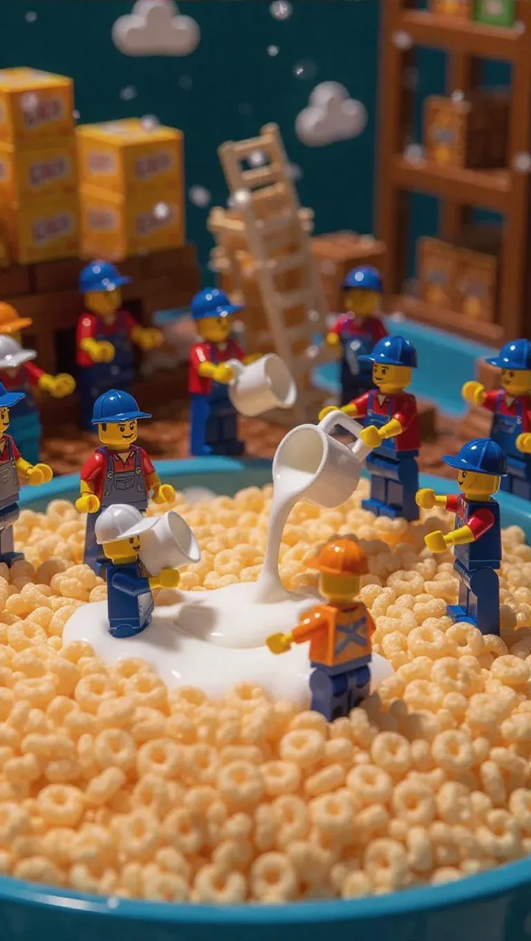 A squad of thumb-sized artisans in visors and work shirts is toiling inside an enormous bowl of cereal. Some are pouring milk with massive pitchers, others are stacking boxes on a miniature conveyor belt, while flurries rise like breakfast mist. The scene resembles a lively cereal factory, complete with ramps and ladders in the bowl.
