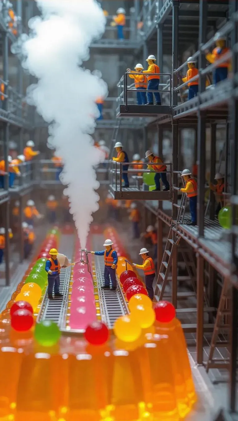 A team of miniature workers in helmets and vests is engaged inside a large jello mold. Some are stirring gelatin with enormous mixers, while others position fruit pieces on a small conveyor belt, as steam rises like smoke. The entire setup looks like a dynamic jello production facility, with scaffolding and ladders included.