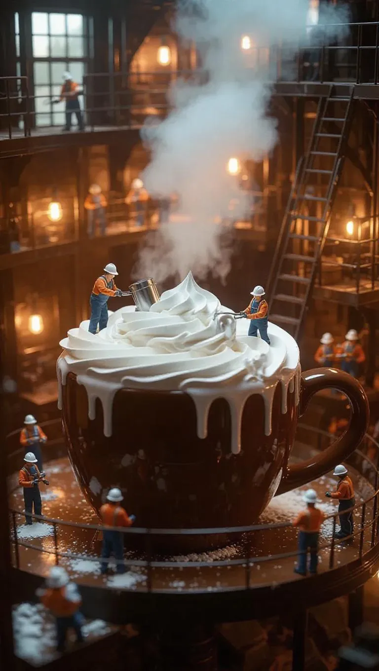 A squad of palm-sized workers in safety gear is laboring inside a giant hot chocolate mug. Some are whipping cream with vast mixers, while others sprinkle marshmallows on a conveyor belt, as ripples rise like steam. The scene captures a bustling hot chocolate factory, complete with stairs and scaffolding inside the mug.