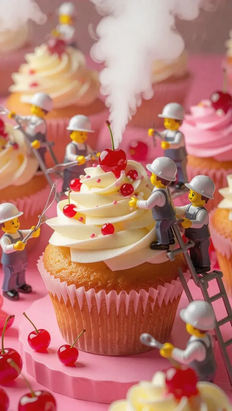 A group of miniature chefs in safety helmets and kitchen uniforms is working inside a gigantic cupcake. Some are mixing ingredients with large whisks, while others are adding cherries on top of a tiny conveyor, as sweet steam billows like mist. The whole environment feels like a cozy cupcake bakery, with ladders and ramps inside the cupcake.