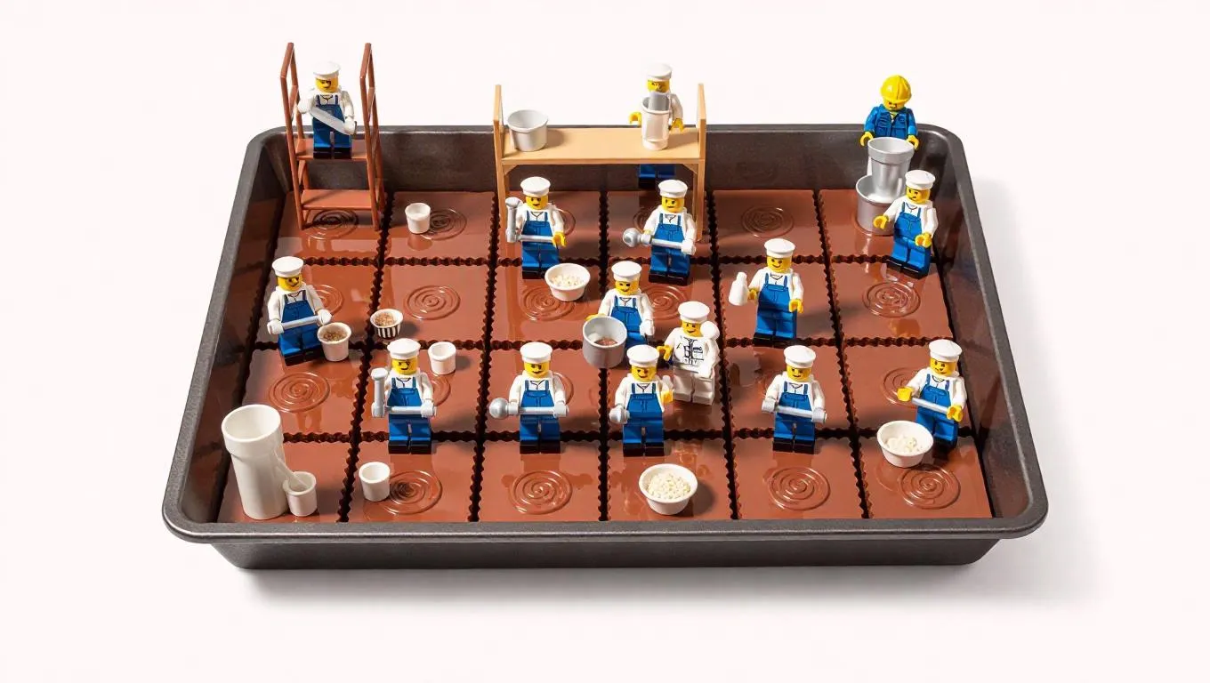 A collective of thumb-sized bakers in safety gear is toiling inside a vast brownie pan. Some blend chocolate with huge mixers, while others sprinkle nuts on a minor conveyor, as sweet aromas rise like cloud. The whole scene looks like a thriving brownie shop, featuring scaffolding and ladders within the pan.