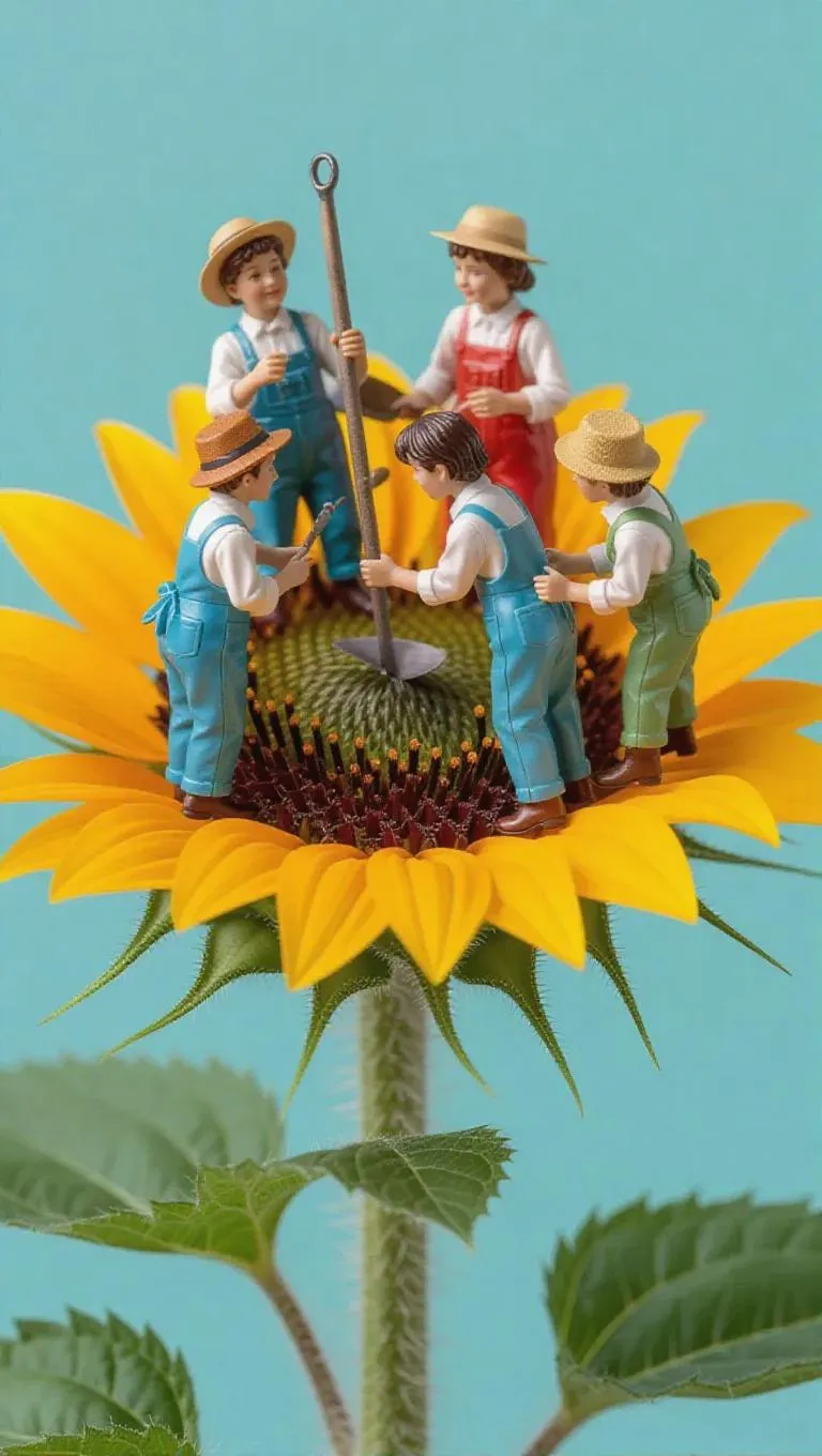 Several thumb-sized figures, dressed in charming vintage clothing, stand delicately on a lush sunflower, carefully sprucing it up with tiny tools. The detailed petals and lofty stem create a nostalgic scene, capturing a moment of whimsy and attention.