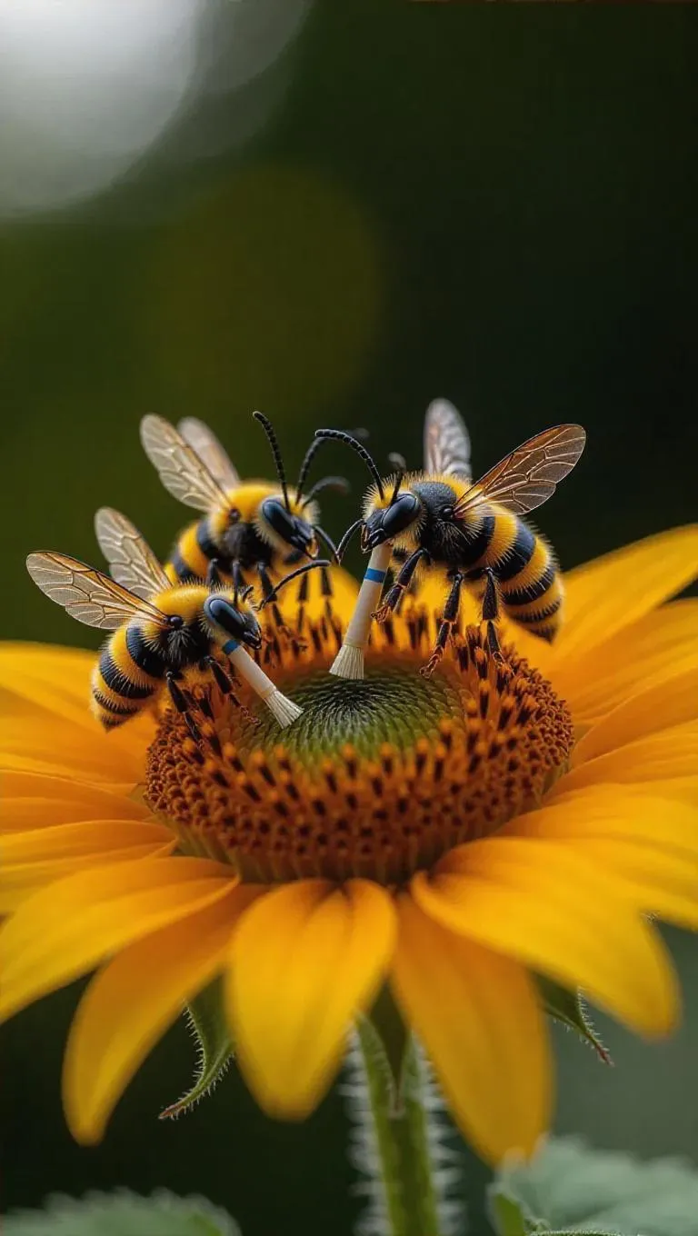 Several thumb-sized figures, in adorable insect costumes, stand delicately on a bright sunflower, playfully grooming it with small brushes. The vibrant petals and towering stem create a charming backdrop, capturing a moment of enchantment and care.