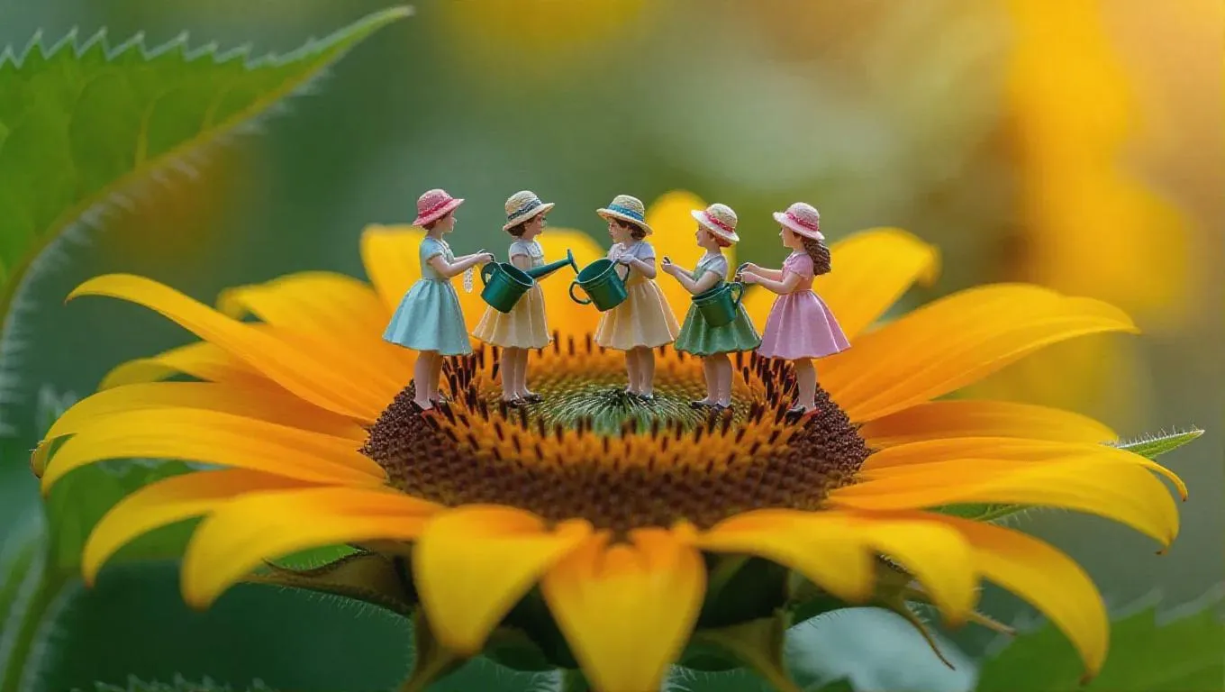 Several thumb-sized figures, clad in garden party outfits, stand delicately on a delightful sunflower, carefully tending to it with whimsical watering cans. The rich petals and tall stem create an elegant backdrop, capturing a moment of grace and celebration.