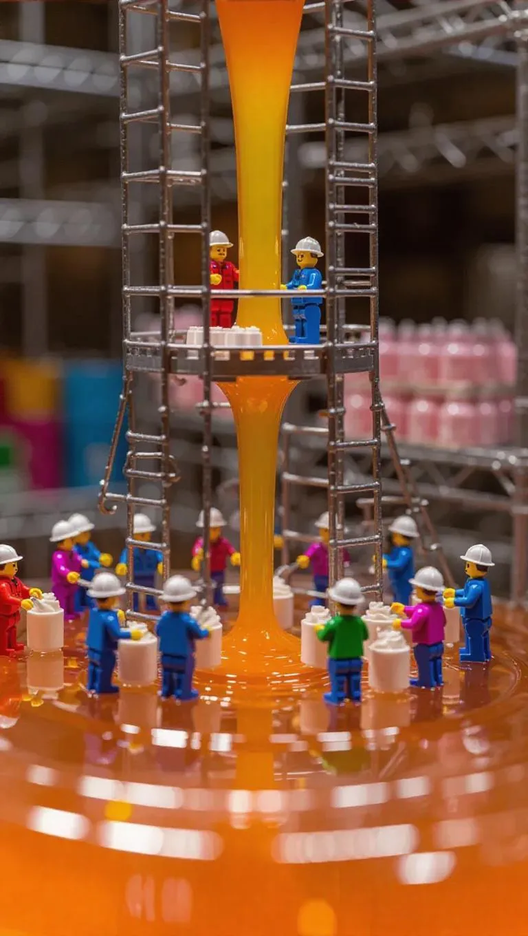 A host of thumb-sized workers in protective helmets and colorful uniforms is toiling away inside a massive syrup fountain. Some are mixing syrup with large whisks, others are packaging treats on a miniature conveyor belt, while sweet scents rise like steam. The entire scene exudes a warm candy factory vibe, with scaffoldings and ladders amidst the fountain.