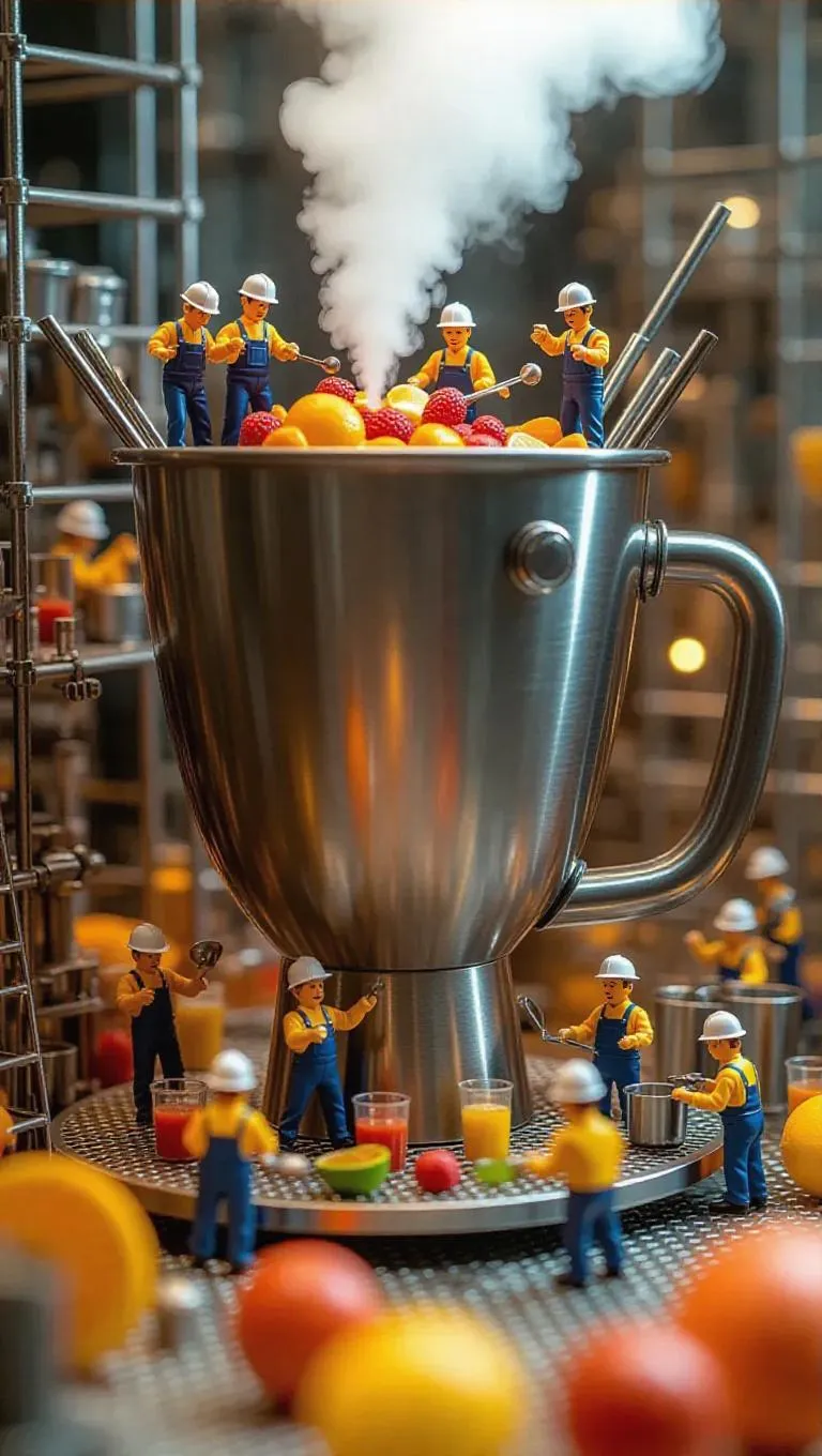 A team of thumb-sized workers in safety helmets and aprons is working inside a massive cocktail shaker. Some are mixing drinks with giant spoons, others are slicing fruits on a miniature conveyor belt, while steam rises like factory smoke. The whole scene looks like a bustling cocktail factory, with scaffolding and ladders inside the shaker.