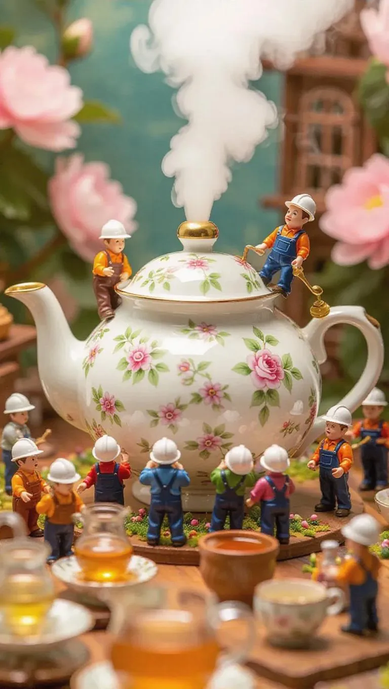 A team of thumb-sized workers in hard hats and overalls is working inside a giant teapot. Some are brewing tea with oversized teabags, others are pouring honey on a tiny assembly line, while steam swirls like clouds. The whole scene looks like a busy tea factory, with quaint decorations and floral designs around.