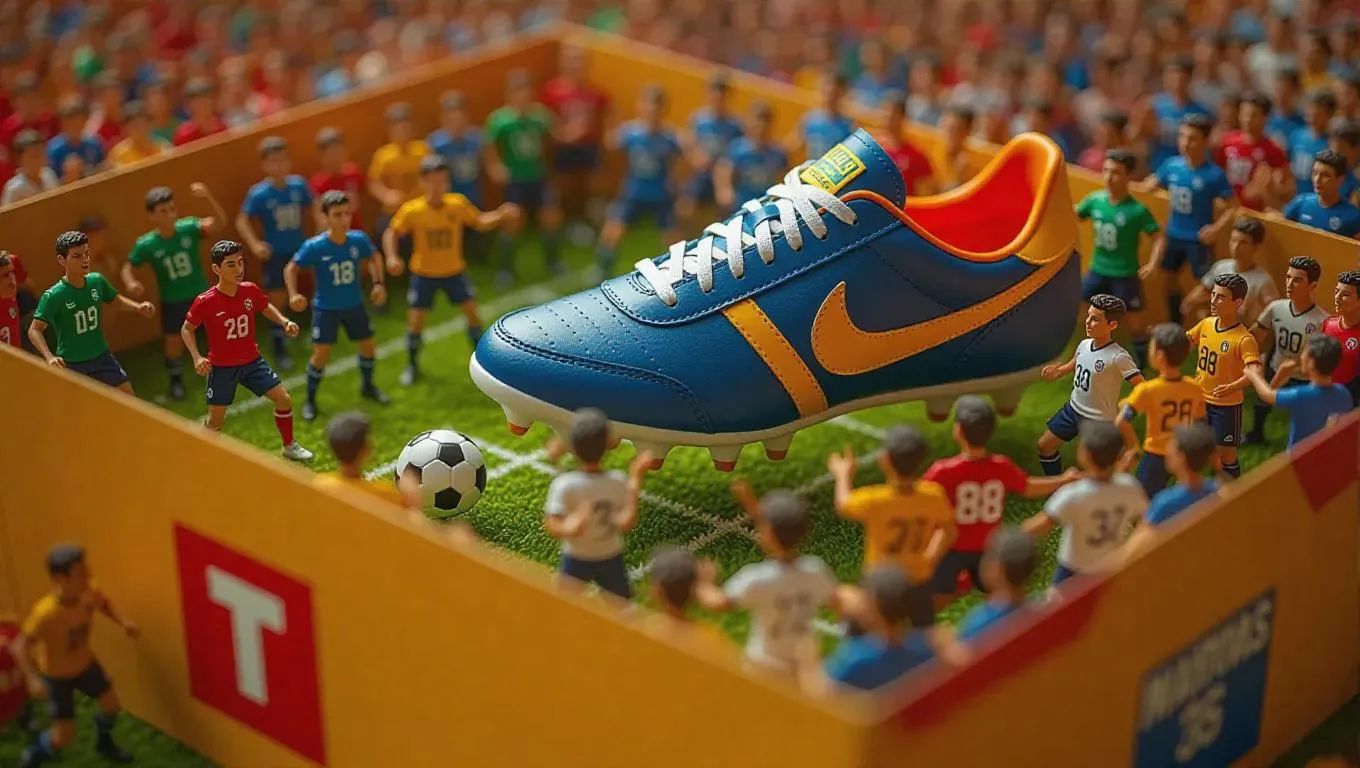 A team of thumb-sized athletes in jerseys is playing soccer inside a giant shoebox. Some are kicking balls with oversized feet, others are cheering on the sidelines on tiny benches, while crowds roar like a stadium. The whole scene feels electrifying, like a spirited game day.