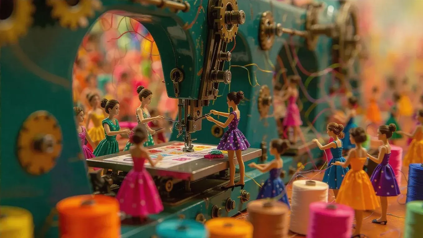 A group of tiny fashion designers in funky outfits is creating dresses inside a colossal sewing machine. Some are cutting fabric with giant scissors, others are sketching designs on a tiny board, while threads hang in colorful spirals. The entire scene resembles a bustling fashion house, full of creativity.