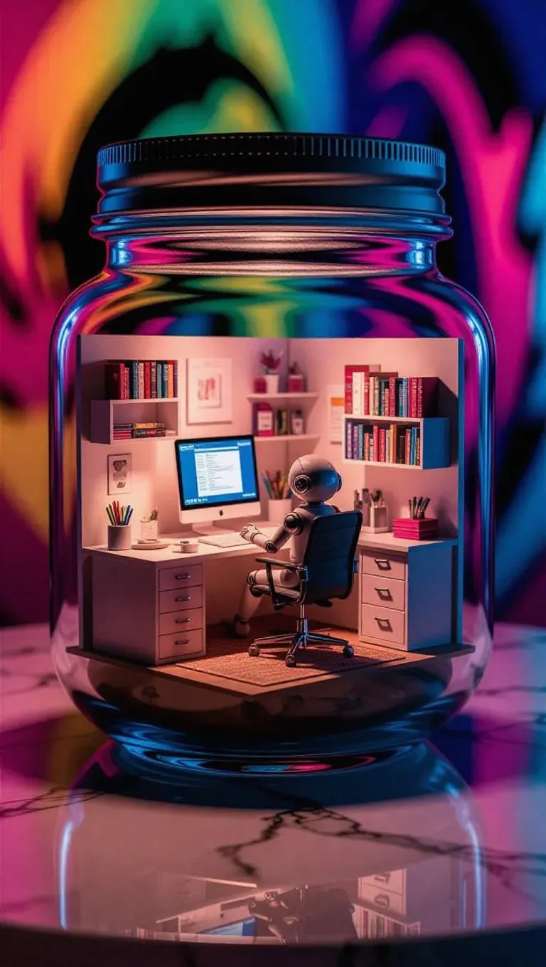 A highly detailed miniature office setup inside a transparent glass jar, featuring a fully furnished workspace with a contemporary desk, computer, chair, office supplies, and tiny bookshelves. A small robot figure sits at the desk, working on the computer. Soft, colorful interior lighting casts a playful glow. The jar rests on a marble surface with a subtle reflection, set against a vibrant, artistic background. Ultra-realistic 3D rendering with sharp details and lifelike textures.