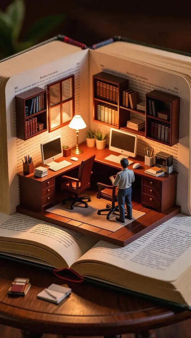 A highly detailed miniature office setup inside an open book, featuring a fully furnished workspace with a compact desk, computer, chair, office supplies, and tiny bookshelves. A small human figure stands beside the desk, looking at a notepad. Warm, inviting interior lighting casts a homely glow. The book rests on a rustic table with a subtle reflection, set against a nature-inspired background. Ultra-realistic 3D rendering with sharp details and lifelike textures.