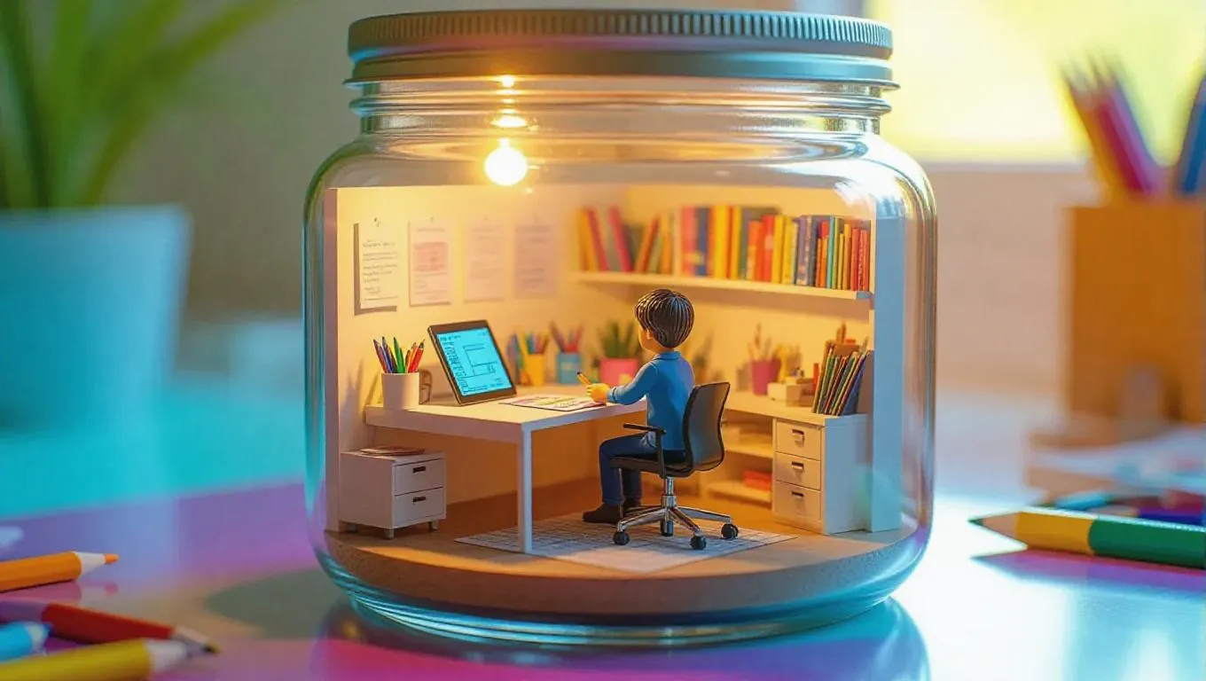 A highly detailed miniature office setup inside a transparent glass jar, featuring a fully furnished workspace with a compact desk, tablet, chair, office supplies, and tiny bookshelves. A small child figure is drawing on the table with crayons. Soft, bright interior lighting casts an imaginative glow. The jar rests on a colorful surface with a subtle reflection, set against a cheerful, artsy background. Ultra-realistic 3D rendering with sharp details and lifelike textures.