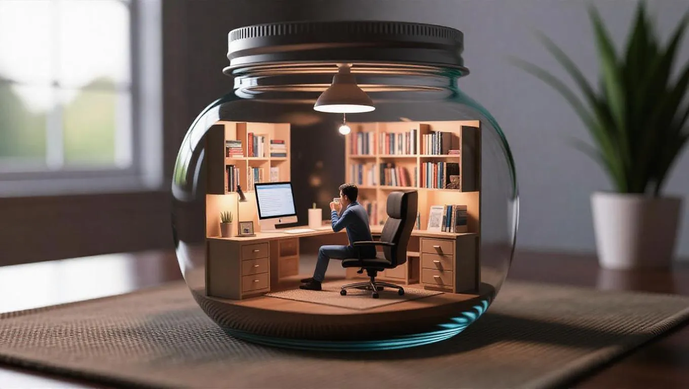 A highly detailed miniature office setup inside a transparent glass jar, featuring a fully furnished workspace with a sleek desk, computer, chair, curios, and tiny bookshelves. A small human figure is reaching for a coffee mug on the desk. Gentle, ambient interior lighting casts a relaxing glow. The jar rests on a fabric-covered surface with a subtle reflection, set against a peaceful, modern background. Ultra-realistic 3D rendering with sharp details and lifelike textures.