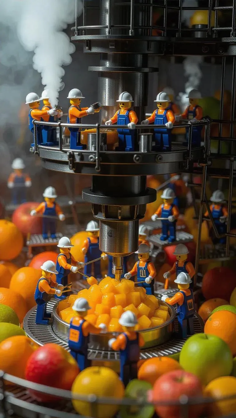 A team of thumb-sized workers in safety helmets and aprons is working inside a giant fruit juicer. Some are mixing fruits with oversized whisks, others are chopping ingredients on a tiny assembly line, while steam billows like factory smoke. The entire setting resembles a vibrant juice-making factory, with platforms and steps inside the juicer.