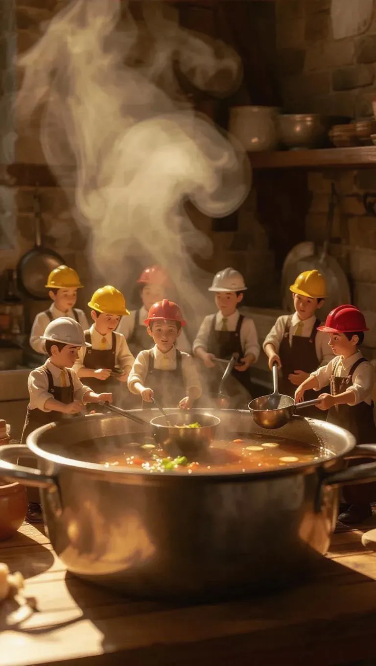 A band of thumb-sized artisans in construction hats and aprons is hard at work within a huge soup pot. Some are stirring broth with huge ladles, while others are chopping vegetables on a small cutting board, and steam wafts like comforting whispers. The entire scene feels like a warm kitchen, with spices and herbs filling the air.