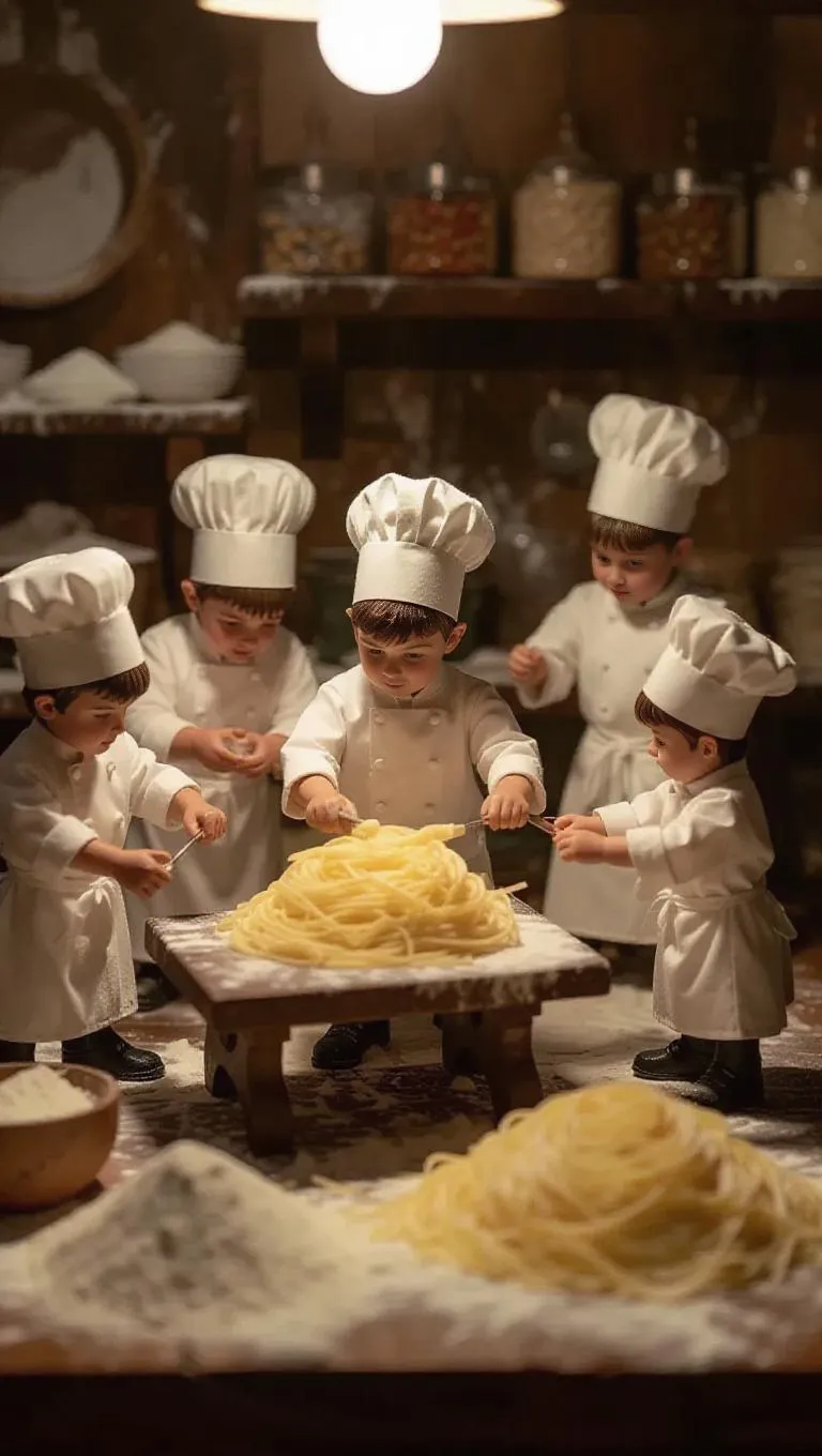 A unit of tiny chefs in protective helmets and tunics is bustling inside an enormous pasta maker. Some are rolling dough with giant pins, while others are cutting shapes on a small workbench, and flour dust swirls like fairy whispers. The whole scene evokes a cozy Italian kitchen, adorned with spices and herbs.