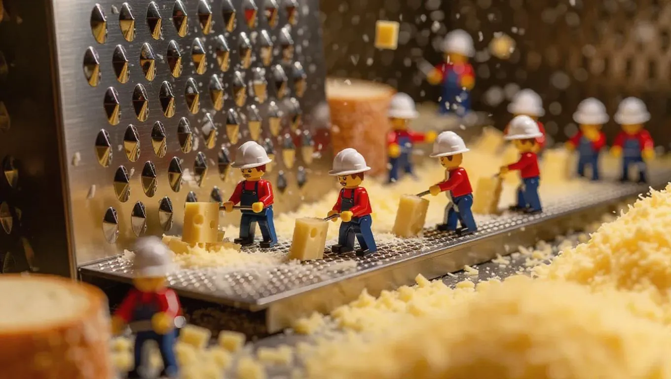 A squad of tiny helpers in hard hats and aprons is active within a massive cheese grater. Some are grating blocks of cheese with oversized graters, while others are slicing bread on a small platform, and shavings float like delicious snowflakes. The atmosphere resembles a lively deli, filled with mouthwatering smells.