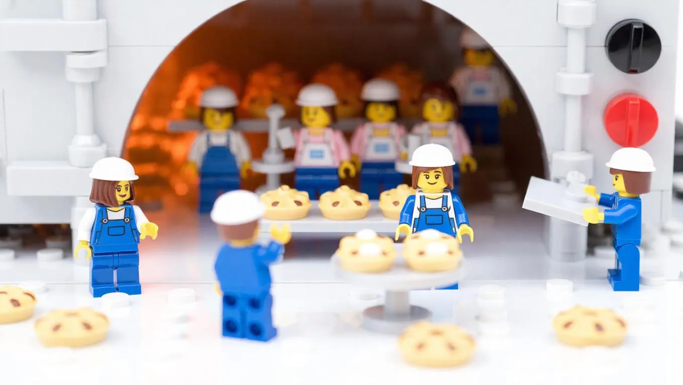 A band of miniature workers in protective gear is crafting desserts inside a tremendous pastry oven. Some are arranging cookies on giant trays, while others are checking cake levels on a small platform, and warm fragrances waft like sweet memories. The whole scene encapsulates a bustling bakery, alive with action.