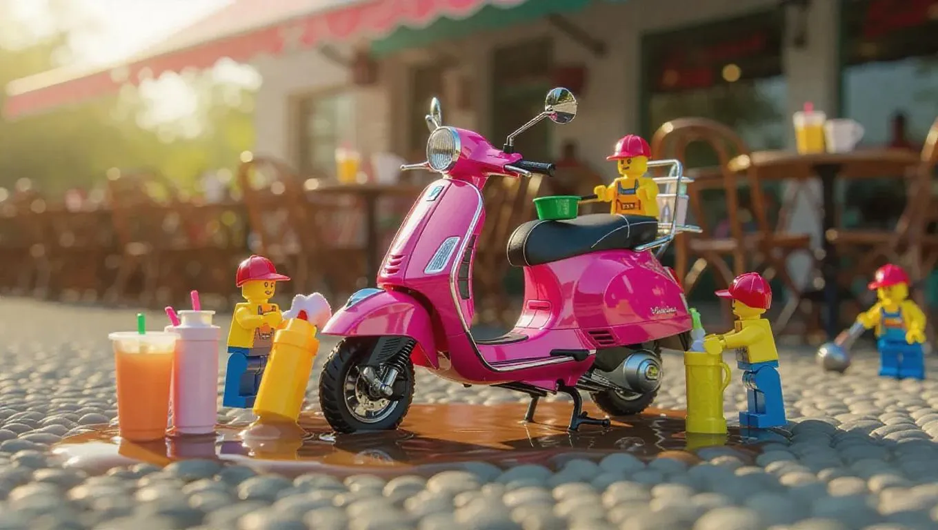 A group of tiny, thumb-sized workers is diligently cleaning a vibrant, pink scooter, which is the centerpiece of the image. The scooter is parked on a pebbly surface, possibly near a coffee shop, and has drink spills on its side, indicating recent activity. The miniature workers are clustered around the scooter, some polishing mirrors while others are wiping down the dashboard. They appear to be focused on their task, using tiny towels and sponges to give it a good shine. The surrounding environment features a bright, clear sky, which casts a cheery light over the scene. Several outdoor tables can be seen in the background.