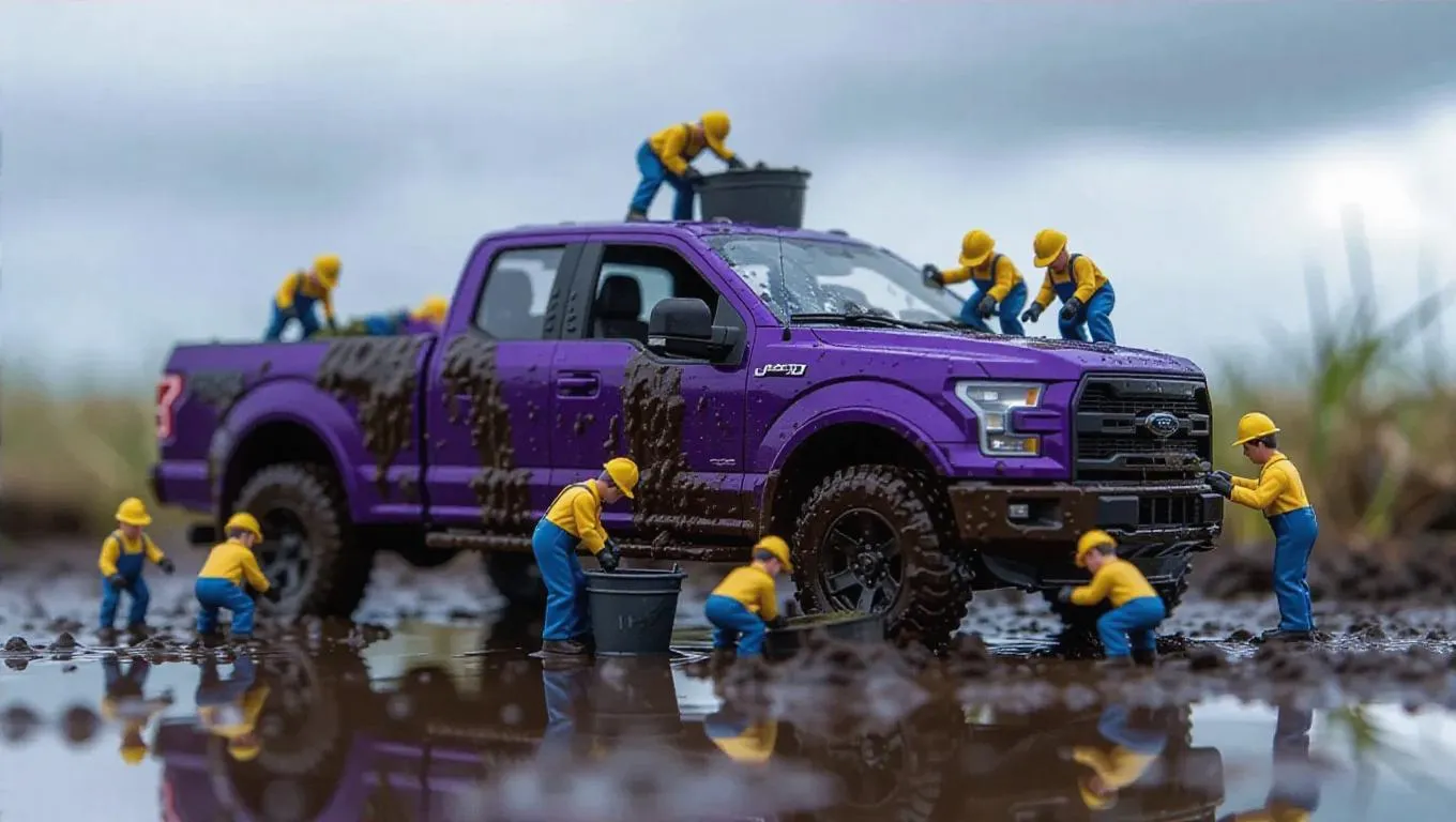 A group of tiny, thumb-sized workers is diligently cleaning a rugged, purple pickup truck, which is the centerpiece of the image. The truck is parked on a moist surface, possibly a rural area or farm, and has muddy spots on its side, indicating recent use. The miniature workers are gathered around the truck, some climbing on top while others are examining details. They appear to be focused on their task, using tiny towels and pails to scrub and rinse the vehicle. The surrounding environment is dominated by a cloudy sky, which casts a cool, shaded light over the scene. There are no other objects or people visible in the image, and no text or distinctive markings are present.