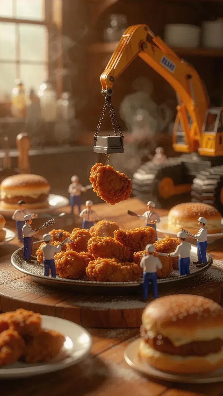 A playful culinary construction site where a massive plate of fried chicken is being assembled by thumb-sized workers. A miniature crane carefully lifts a fresh piece of chicken, while tiny chefs coat it with seasoned flour using small brushes. Some workers arrange the chicken into place like a sculpture, while others carefully fry it in tiny pans. Steam rises gently, hinting at the warmth of freshly fried chicken, while the blurred background reveals a Southern-style diner with biscuits and gravy nearby.