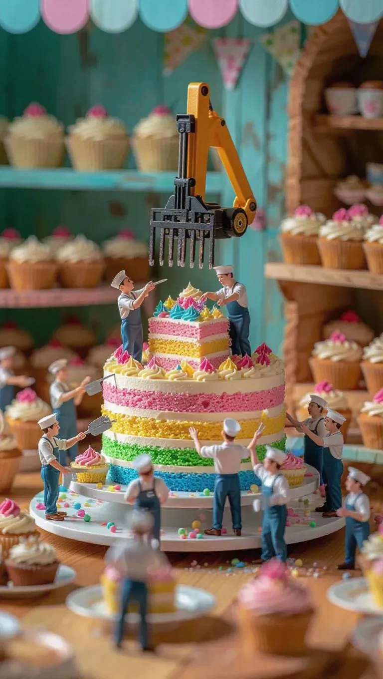 A whimsical bakery construction site featuring a giant cake being assembled by thumb-sized bakers. A tiny forklift lifts a colorful layer of cake, while miniature chefs spread frosting using petite spatulas. Some bakers arrange the cake decorations like art, while others carefully bake in small ovens. Sweet aromas drift in the air, hinting at the delights to come, as the blurred background reveals a charming café with pastries and coffee nearby.